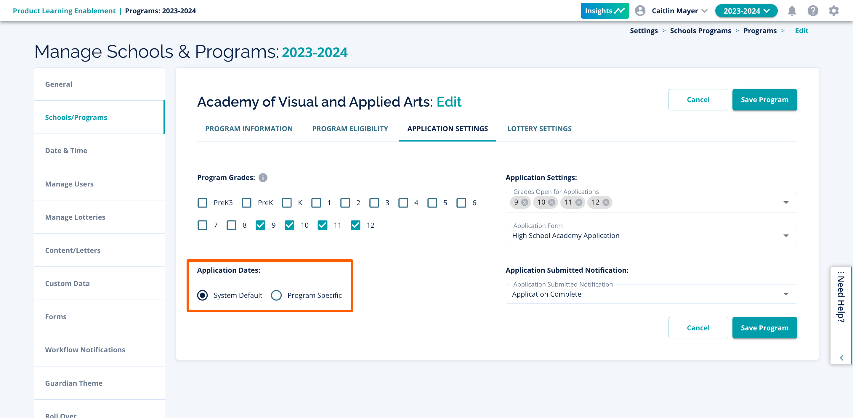 - Choose whether this program has its own application date window (and set it!) or if it will follow the system default application window (set in Program Categories).