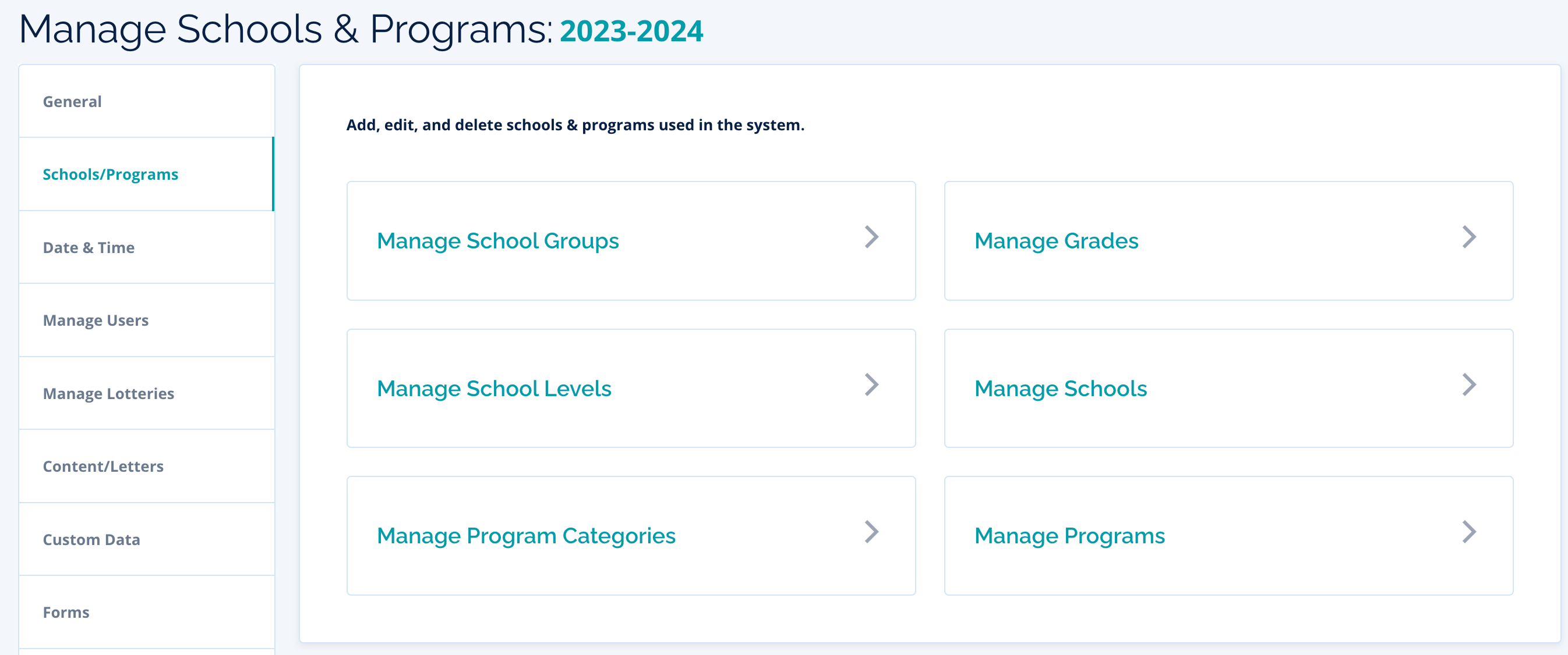 Programs will be updated by going to Settings > Schools/Programs > Manage Programs.
