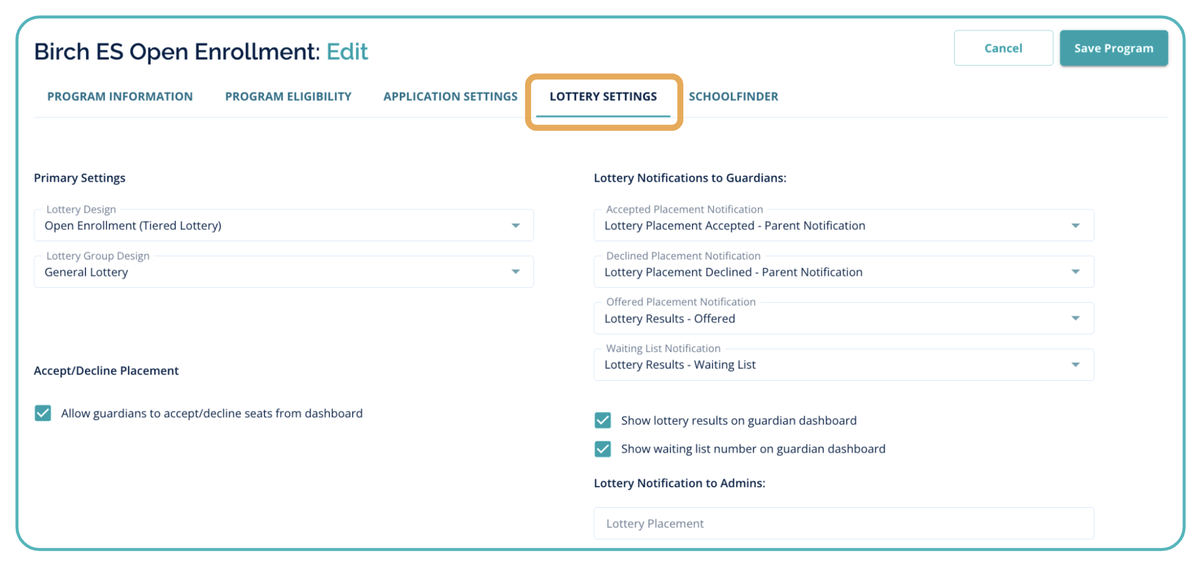 - Settings > Schools/Programs > Edit > Lottery Settings Tab