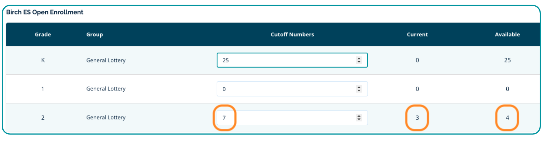 The cutoff number assigned in Settings > Manage Lotteries > Manage Cutoff Numbers tells the system how many seats you would like to fill in the lottery for the grade level of the selected program.
