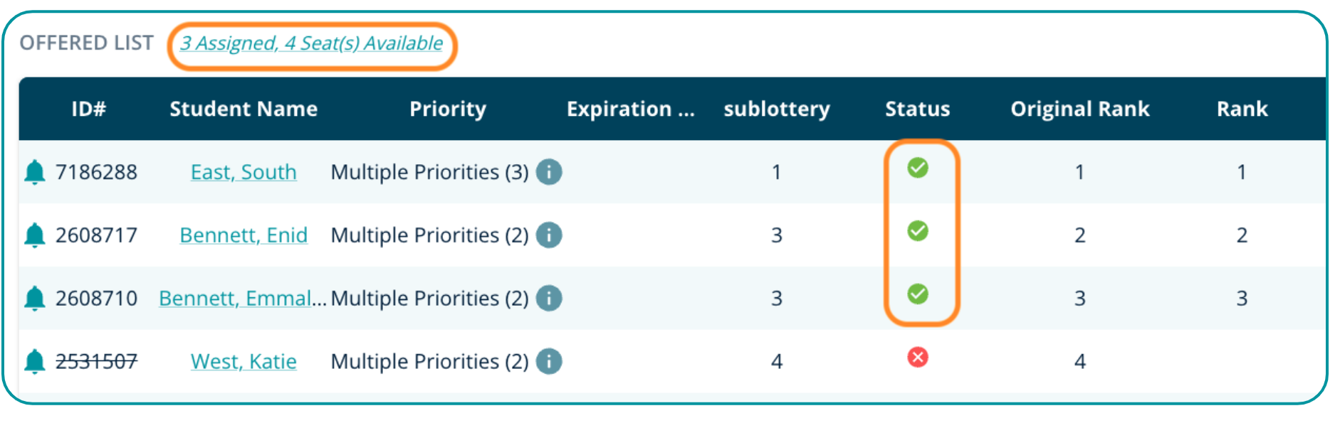 Assigned seats = the number of seats that have been offered and accepted. The assigned seats number can be less than or more than the seats available because there may be fewer applicants than seats available OR admins have the ability to overseat the offered list as needed.