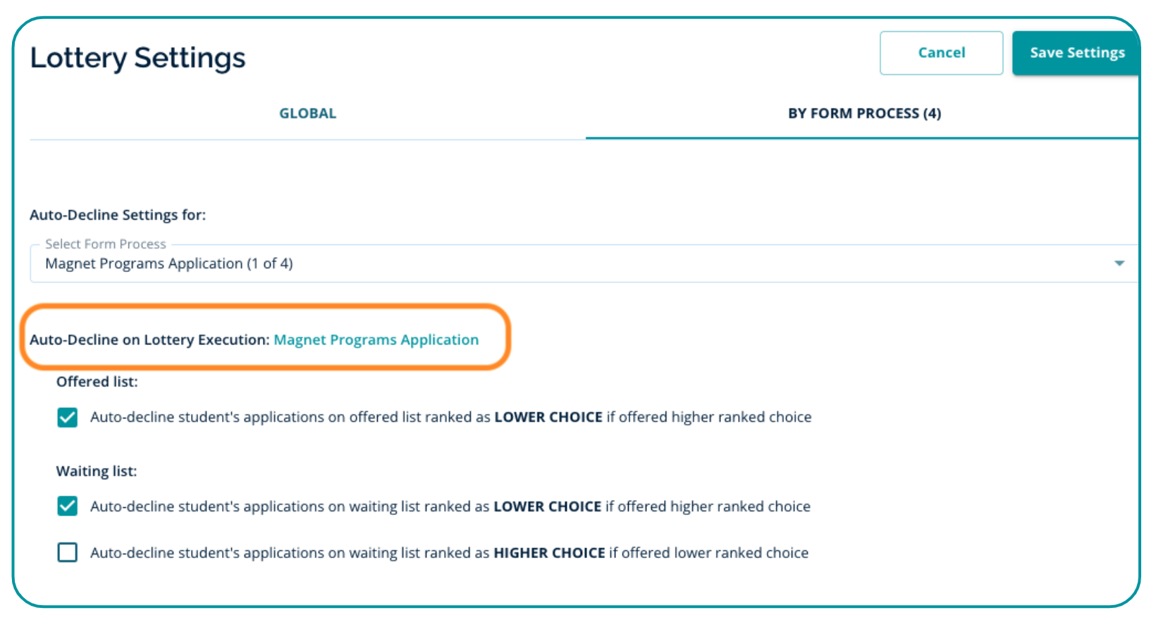 - When enabled, any applications that have been ranked as higher choice and placed on a waiting list will be auto-declined if a lower choice application is placed on the offered list.
