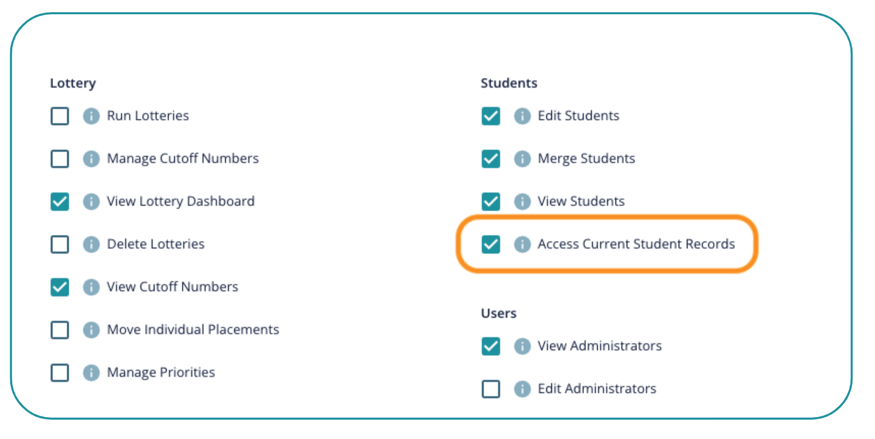 - When enabled, the admin is granted access to any student who currently attends the school of the program the admin is assigned to. Even if a student is applying to another program at the school (other than the admin's assigned program), the student will be visible when this permission is enabled.
