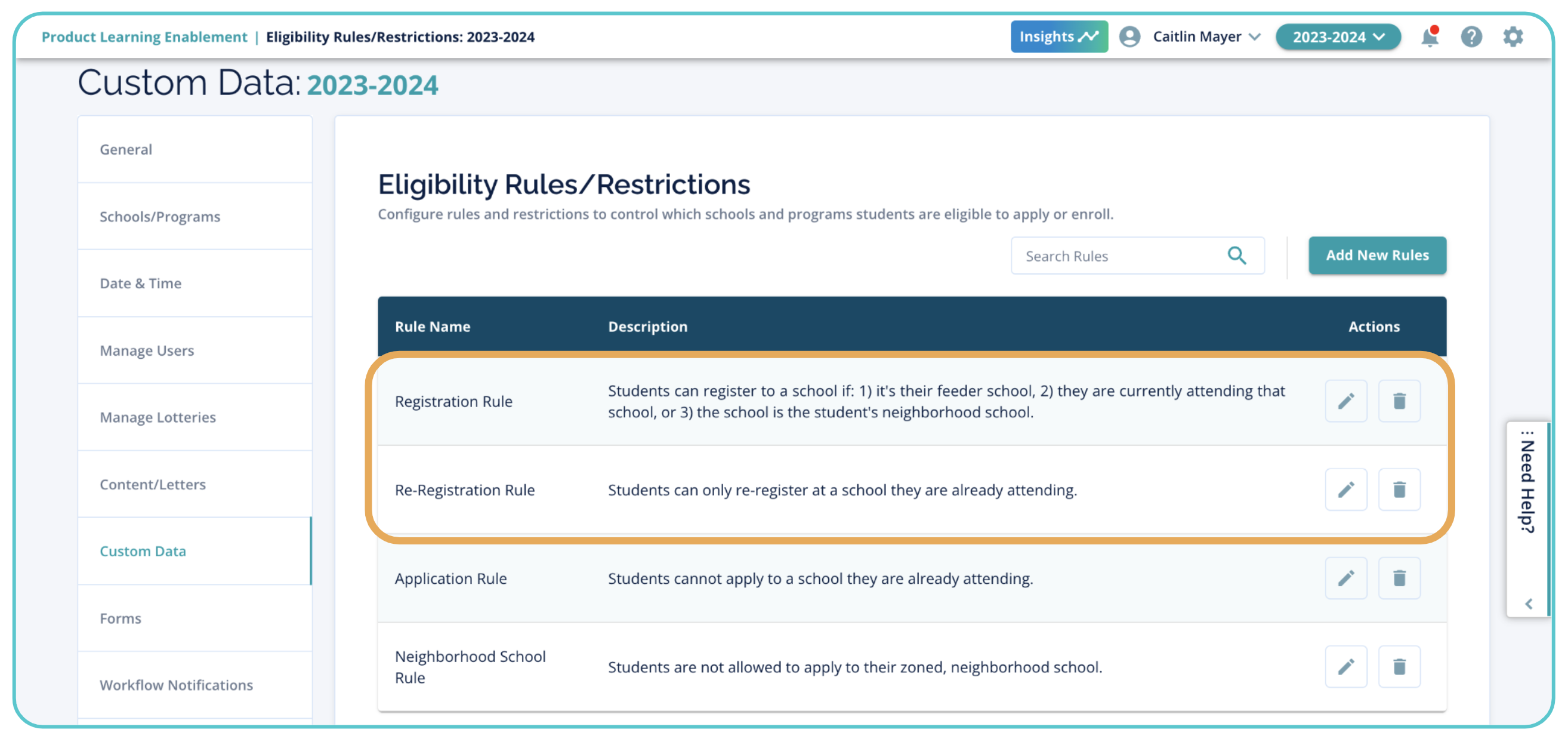 - Returning Students: Re-Registration rule needs to be reviewed and assigned at the School Group