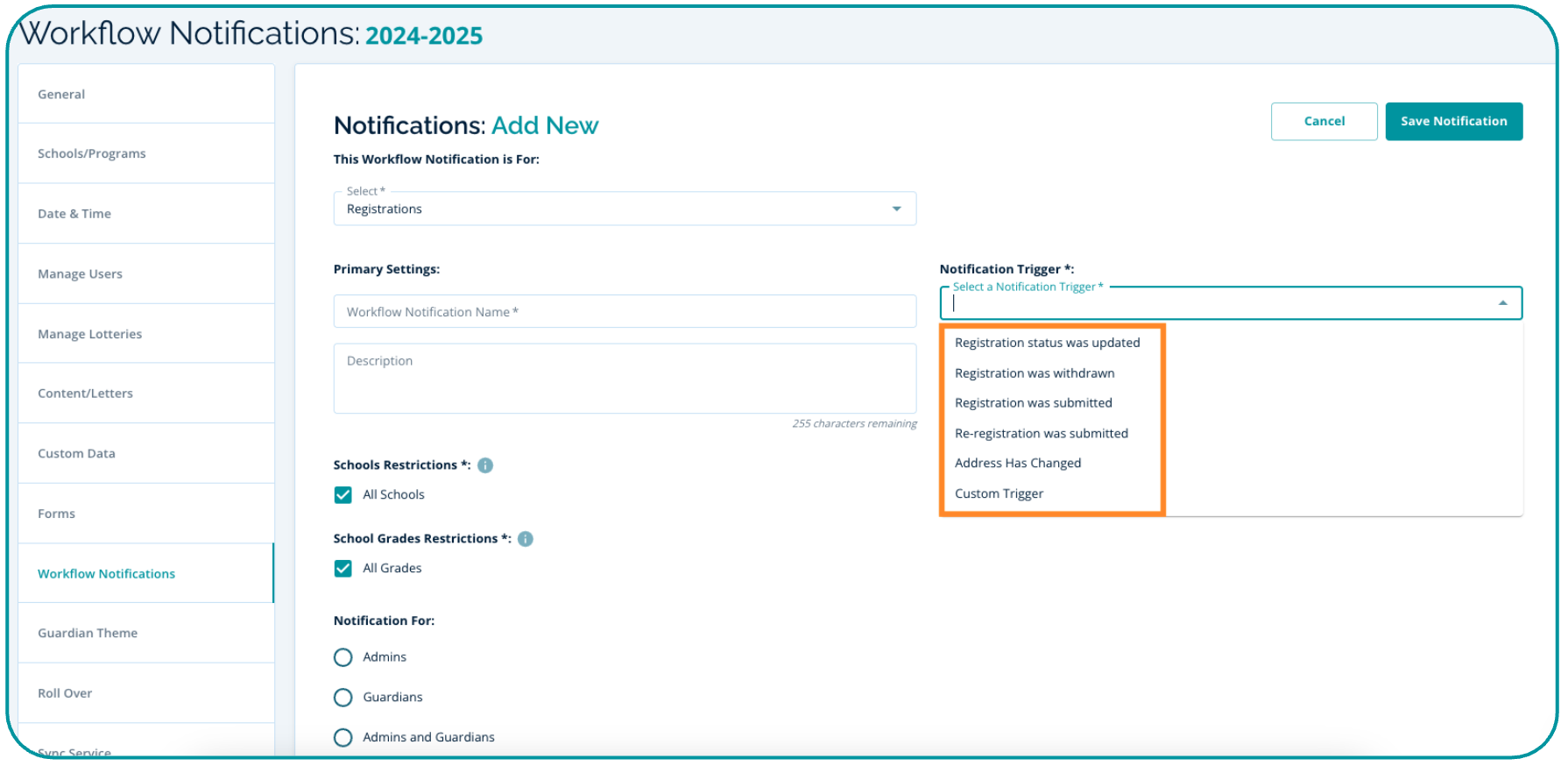 Review your registration and re-registration dates, as well as the timezone and the school years that guardians have access to.