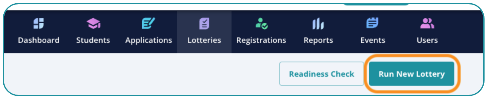 Click the Lotteries icon in the top navigation bar. We recommend that you run the Lottery Readiness Check to ensure that all critical components are in place before running a lottery. Click the Run Lottery button to begin the process of configuring your lottery run.
