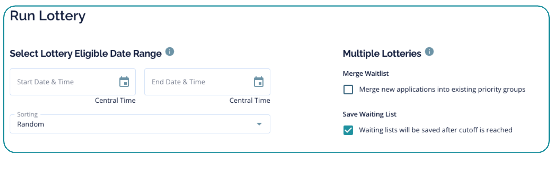 Step One: Input the date range for your lottery eligible period. Only applications that were submitted in the specified date range and have been marked as eligible will be included in the lottery run.