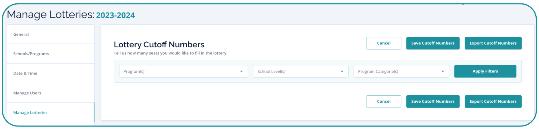 Cutoff numbers determine the number of seats where the lottery list should "cut off" offers and then begin placing students on the waitlist. Admins will enter the number of seats that are available for each grade, at each program before the lottery is run.