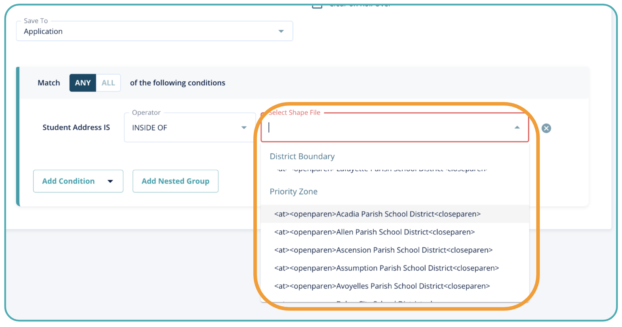 Similar to the School Zone boundary type, the Priority Zone boundary type will be selected when importing individual zones that determine whether students receive a specific priority for the lottery. Priority Zones are only selectable in the Student Address condition in the rules engine. They are not directly assigned to any schools or groups.