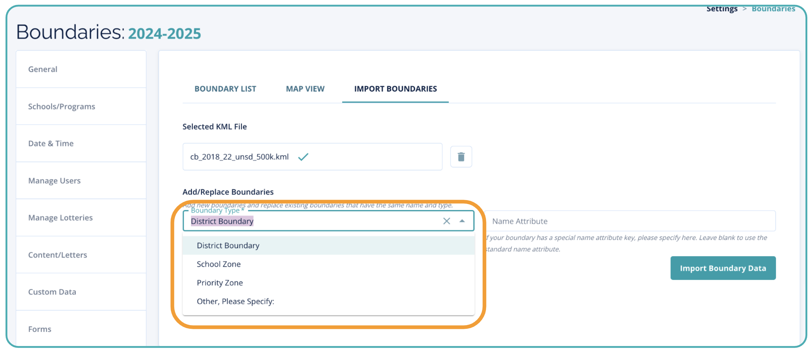 The Boundary Type selector exists so that uploaded boundaries can be categorized according to what the boundary is used for. This also determines where in Enroll the boundaries can be selected and used.