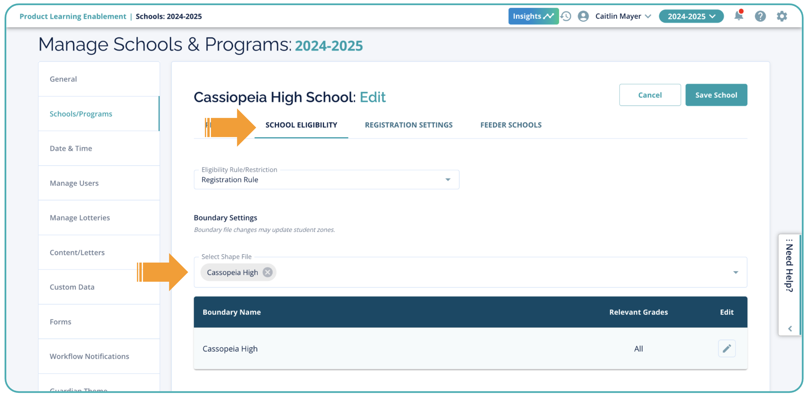 For example, if students are allowed to directly register to the school they are zoned for but are not allowed to register at any other schools, you would import these boundaries as a School Zone boundary type and then select the boundaries for the appropriate schools in school settings then create corresponding rules.