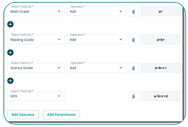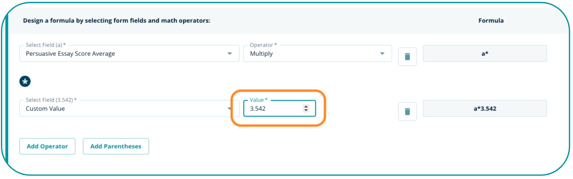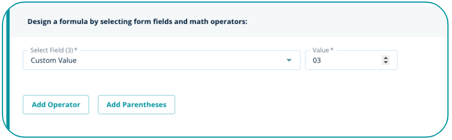4. If you need to perform a calculation that includes a set value in your equation (a+b+c) / 3, you may select the field `Custom Value` and input the number (i.e. "3") to be used in your formula with any of the operators (add, subtract, multiply, divide).