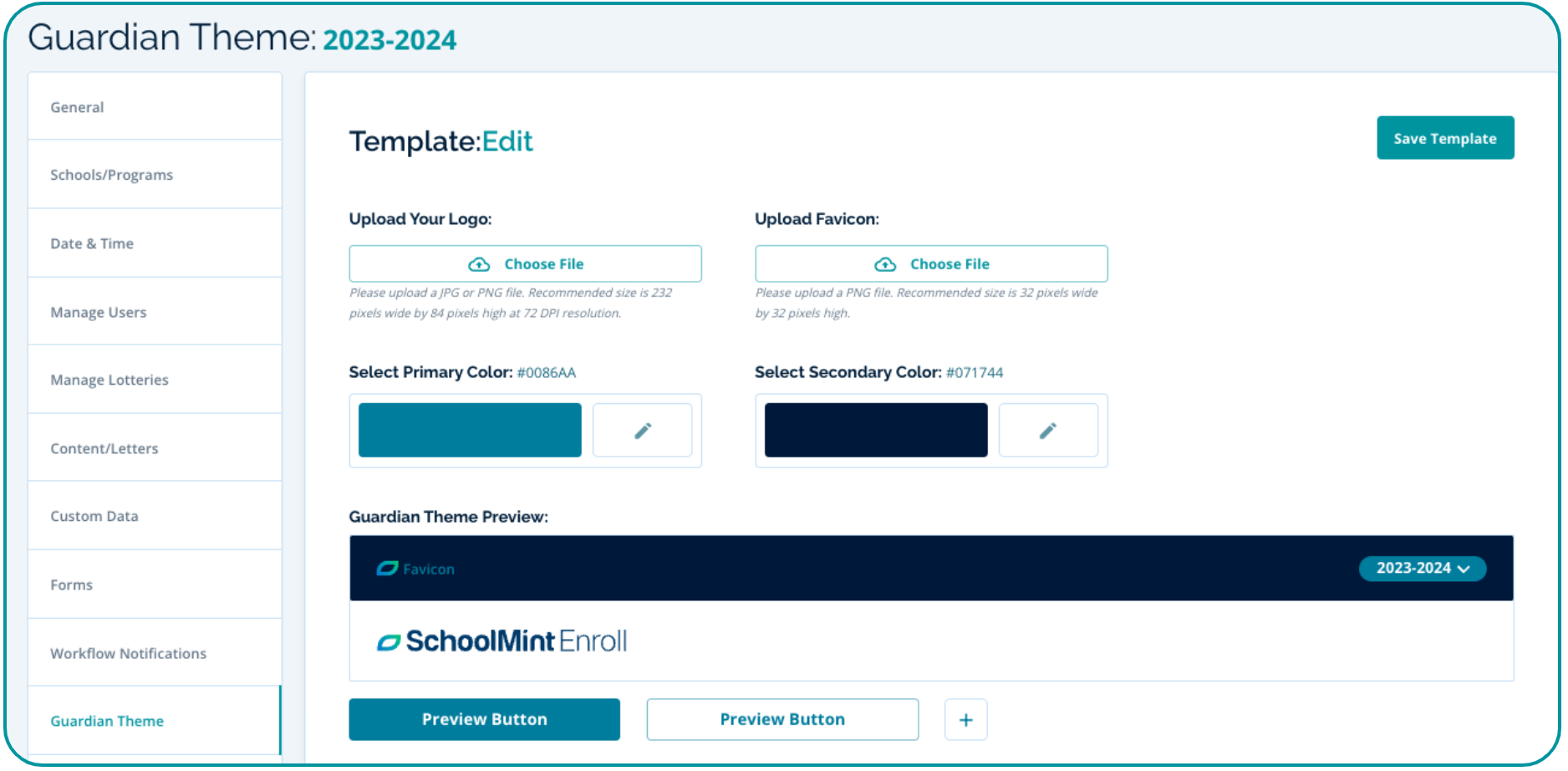 Found under Settings > Guardian Theme, admins have the ability to customize the branding of the family experience in Enroll. This allows organizations to have a consistent theme across their external district or school website and a consistent guardian experience in Enroll.