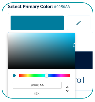 Using the pencil icon next to each color block, use the slider dot across the color spectrum to select each color. You also have the option of entering a hexadecimal, RGB, or HSL color code.