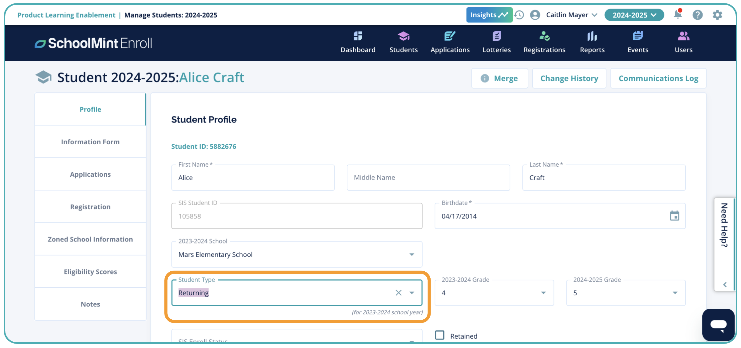 When a student record is created, it is always saved as a "new" student. If a student should be a "returning" student instead, you can access the student profile and update the "type" field from new to returning (shown below).