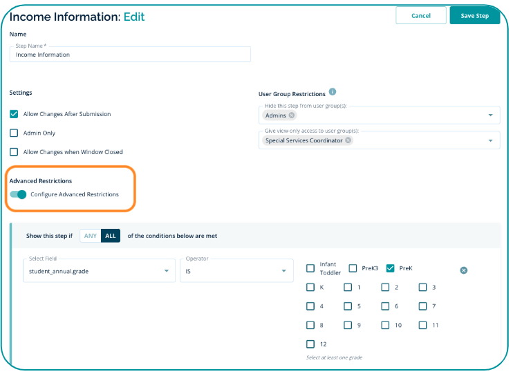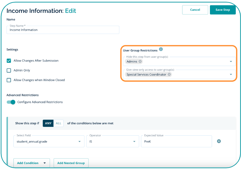 In the example below, the Admins user group will not see the Income Information step, and the Special Services Coordinator will have view-only access. The Super Admin user group will still be able to see and edit this step as they are listed in either of the restrictions.