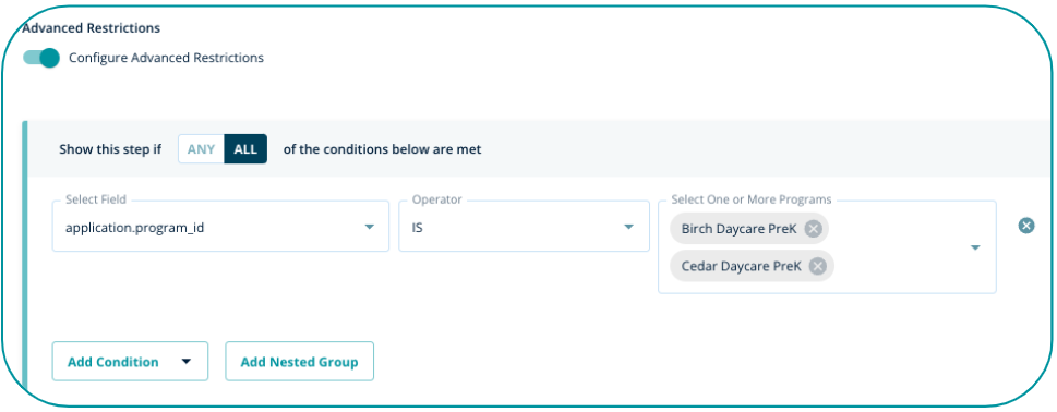 - You could also only show a step if the family selects a specific program(s) in a prior step. The logic for this restriction would use the Programs condition and be based on program id (name):