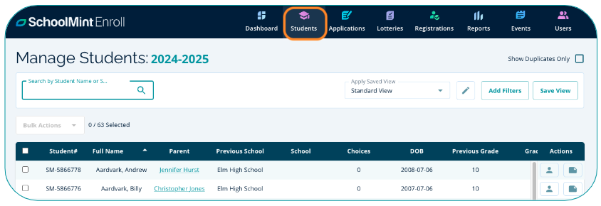 In Enroll, the Manage Students screen displays all students that have been created/imported in the Enroll system. The student's profile and notes can be accessed here, as well as the bulk actions to email/text, export, or merge duplicate students. |