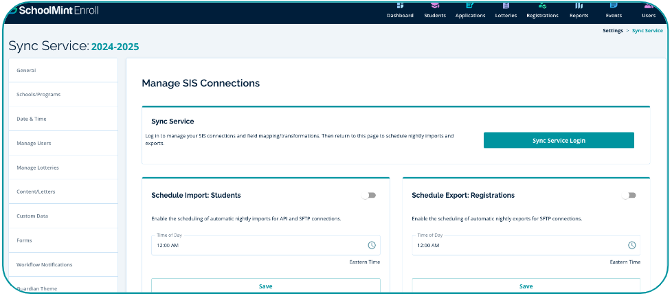 In Sync Service, a SFTP (secure file transfer protocol) connection may be set up where SchoolMint and your organization can both send and receive secure files on a nightly basis. An SFTP connection is used when the SIS provider does not have a direct API with Enroll.