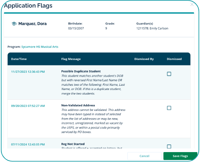 Important Note: “Guardian Access”, found on the Settings > Date & Time page, must be enabled for the school year for flags to trigger and recalculate when changes are made to students, applications, registrations, etc.