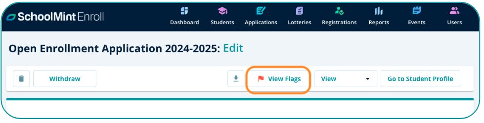 - Within an individual application or registration record, a View Flags button is available at the top of the page to display the flag details modal