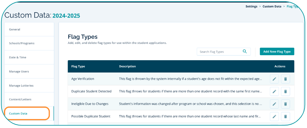 Several default flags are available in Enroll and may be reviewed under Settings > Custom Data > Flag Types: