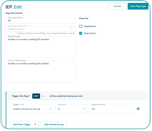 - Using the rules engine, specify what logic will trigger this flag and if this flag will be triggered by ANY or ALL conditions that are met. Set the conditions based on the field, an operator, and what value should be in that field. (e.g., Flag triggered if a student answers 'Yes' to the question "Does this student have an IEP?"