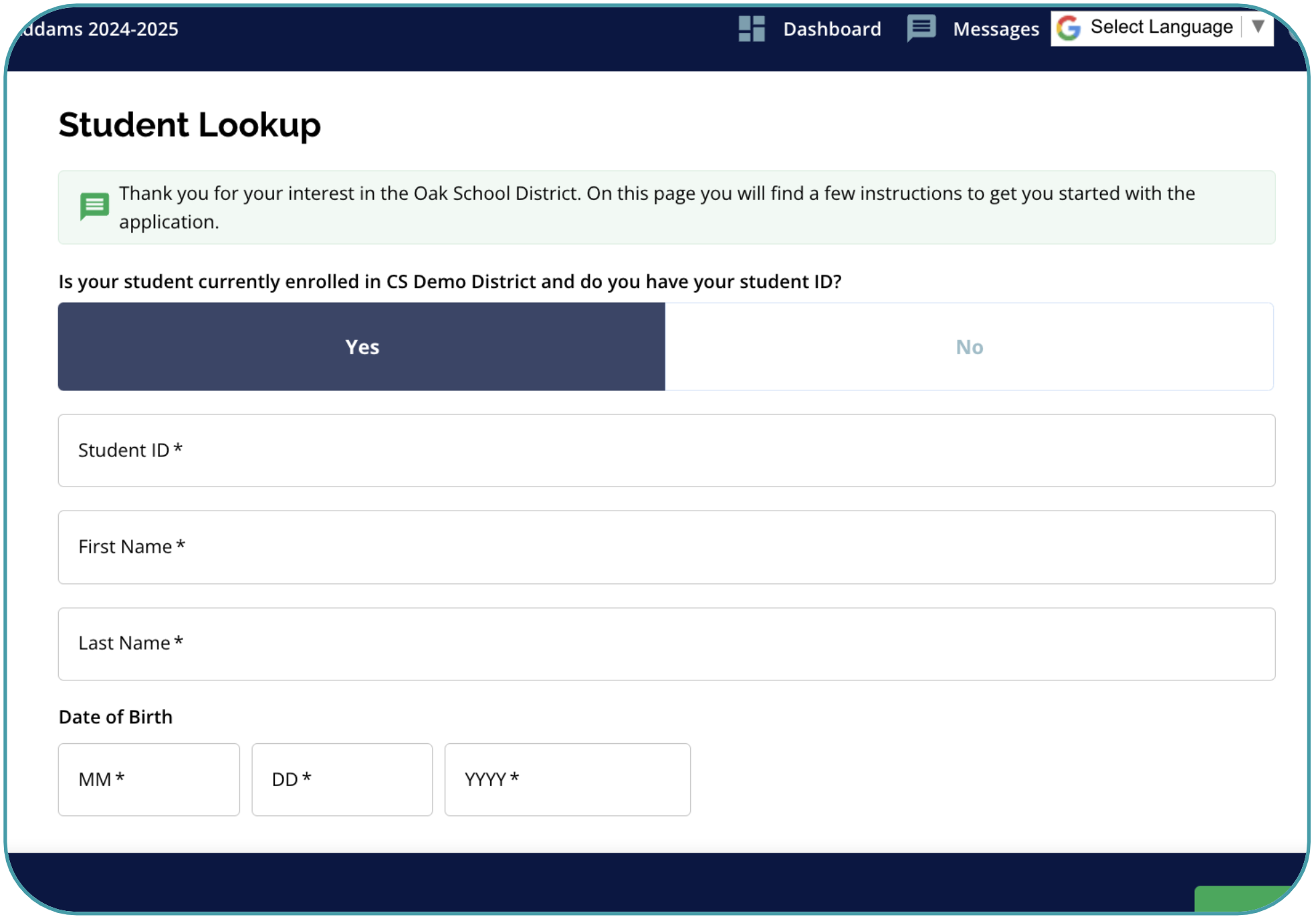 The Student Lookup feature gives families the ability to search for their student in Enroll by SIS ID, First Name, Last Name, and Date of Birth. All values must match (including special characters) how the student was imported into Enroll in order to locate the student in the system.