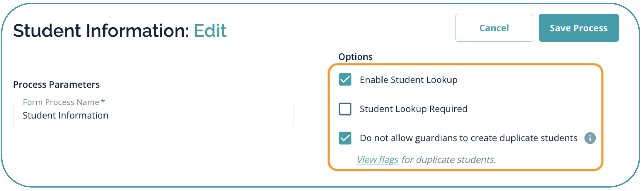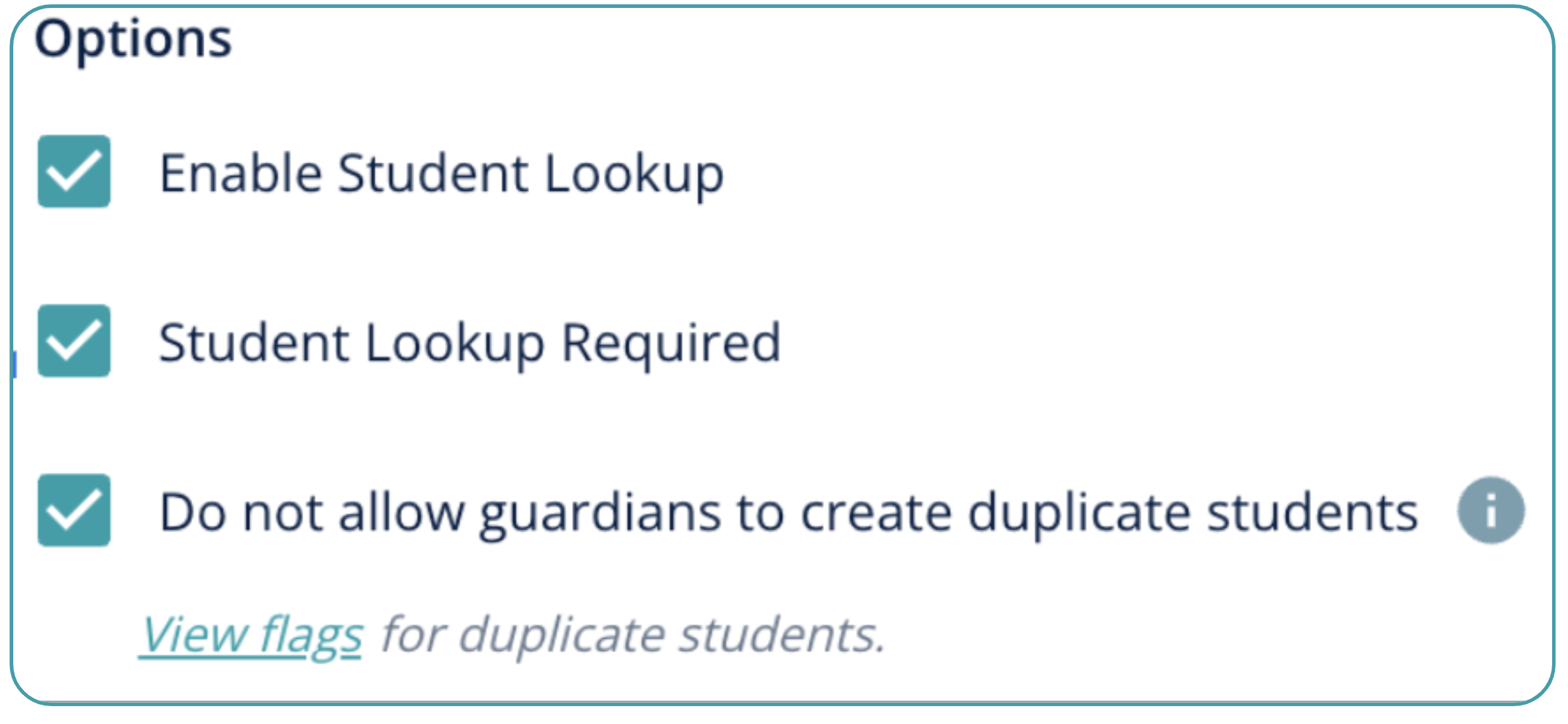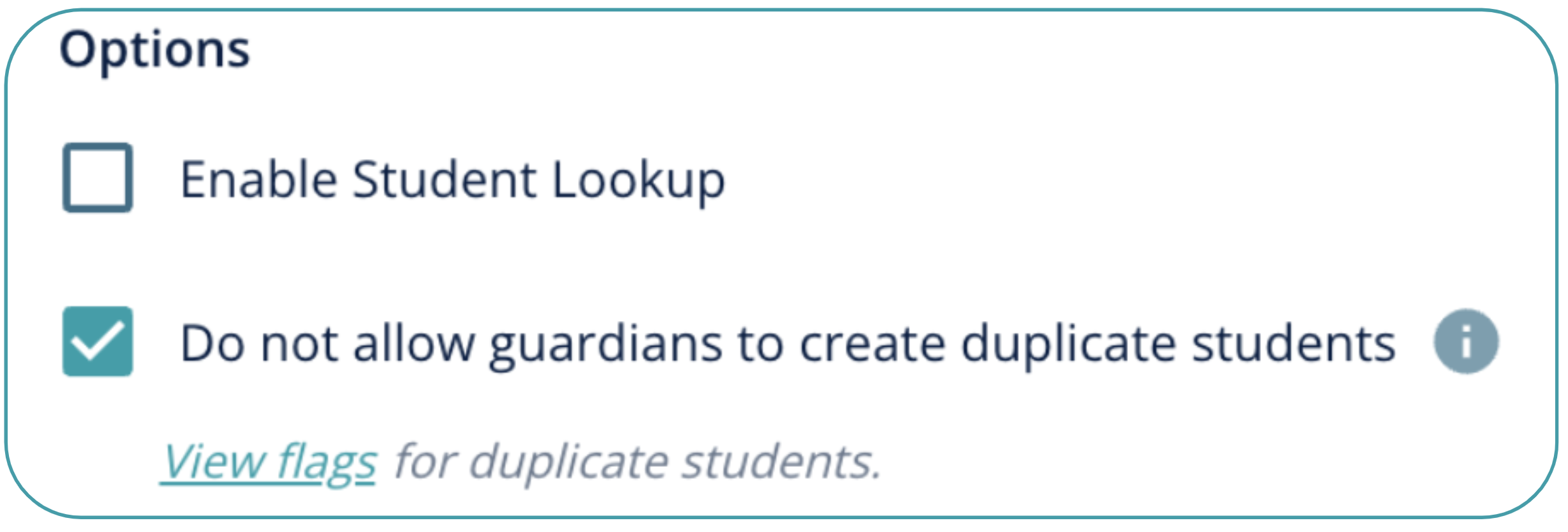 A related, and highly impactful, setting is available on the Student Information Form only: "Do not allow guardians to create duplicate students".