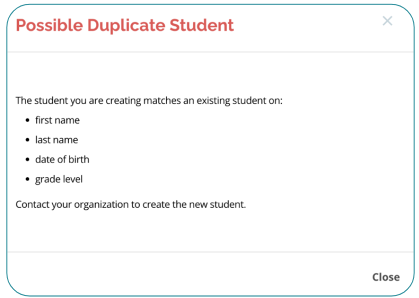 Like with other platform content, the alert modals that display to guardians when they attempt to create a duplicate student are editable / customizable.