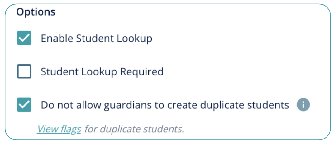 - Select “Student Lookup Required” if you require guardians to look up their student using their Student ID