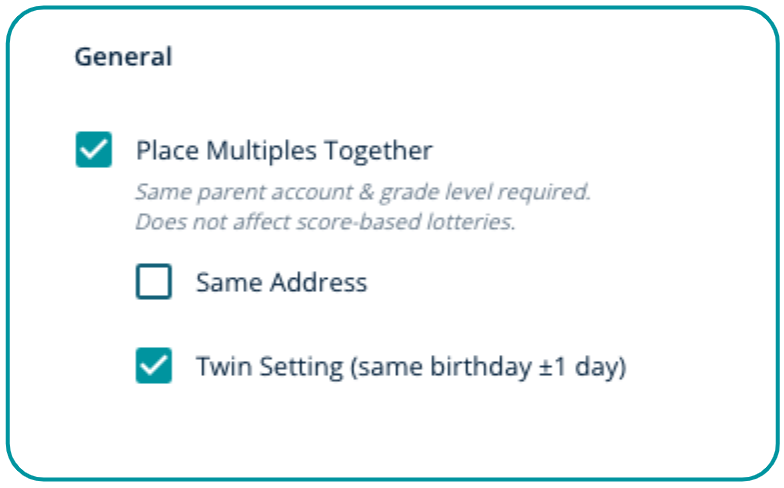 On the Settings > Manage Lotteries > Lottery Settings page, in the bottom right corner the Place Multiples Together option is available. This setting is used to ensure that siblings who are Multiples (as defined by one of the selections seen below) are placed sequentially on the lottery list.