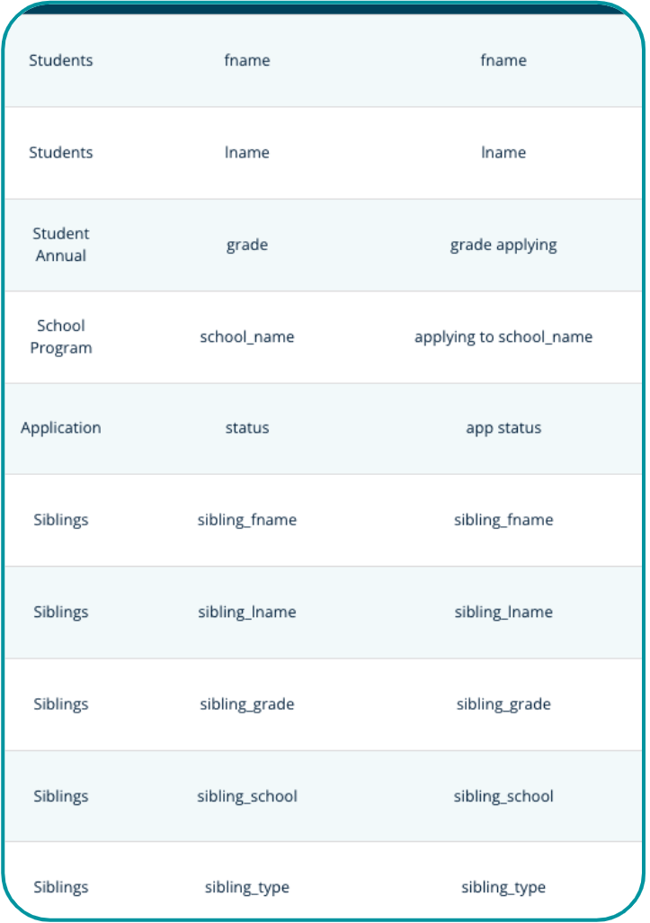 3). Add the fields below to your report for key information about the student applicant and the sibling.