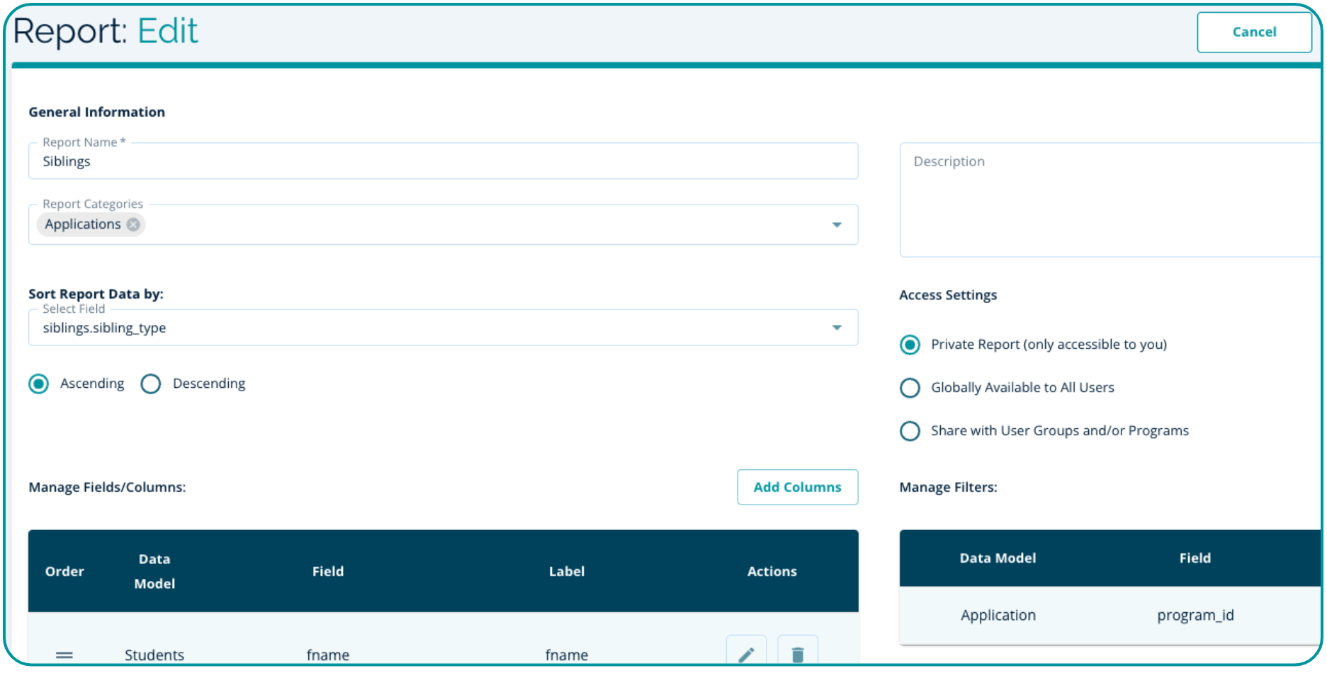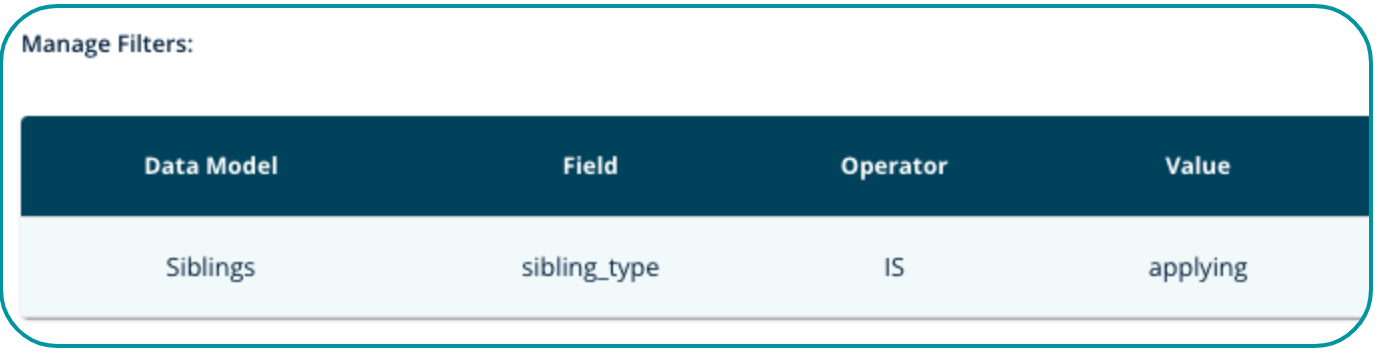 5). If desired, add a filter to only show this information for certain Programs, or perhaps you only want your report to include Siblings Applying - add the sibling_type field as your filter.
