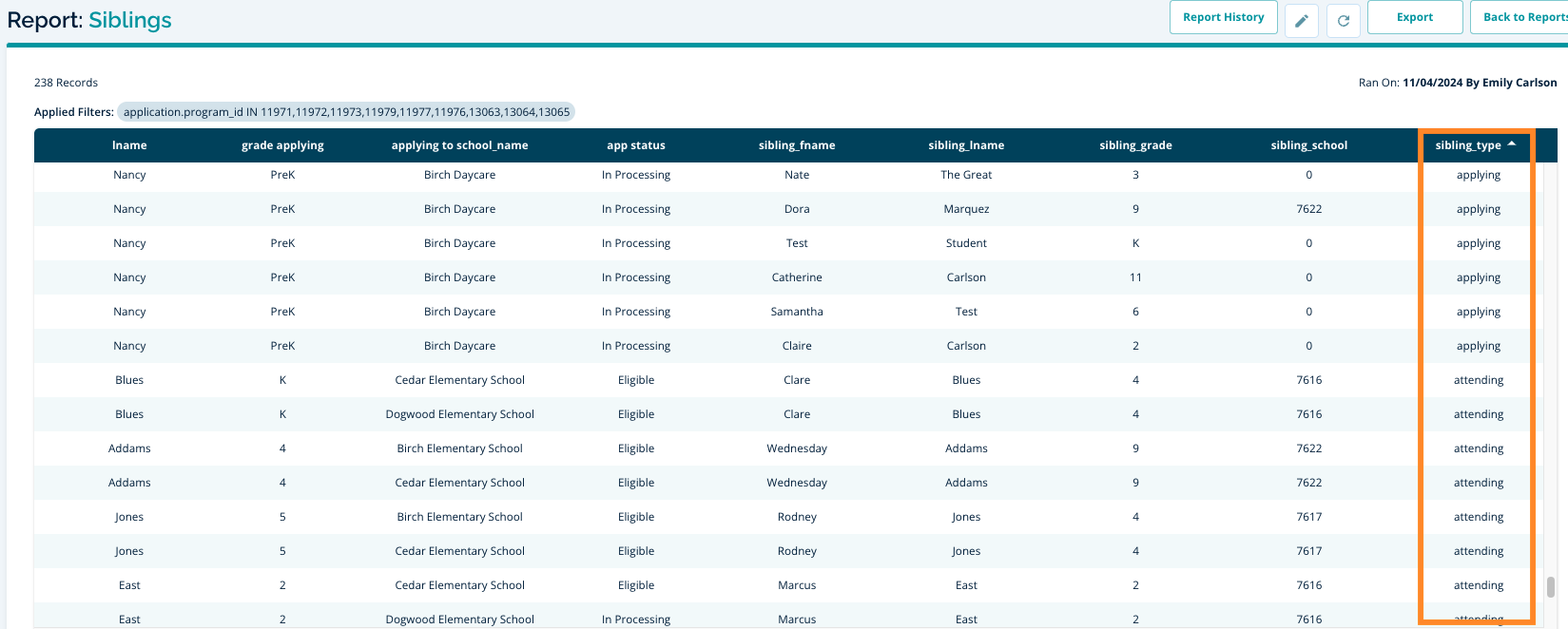 - A Sibling Applying report is particularly useful when identifying lottery list movements for linked siblings.