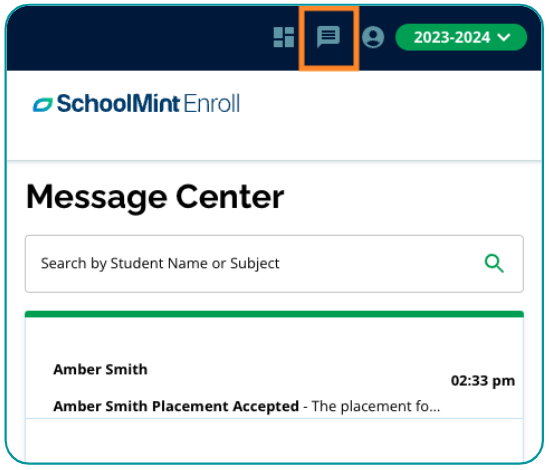 By clicking the message icon at the top of the Dashboard, guardians can view messages that were sent to document each step of the offer > acceptance process.