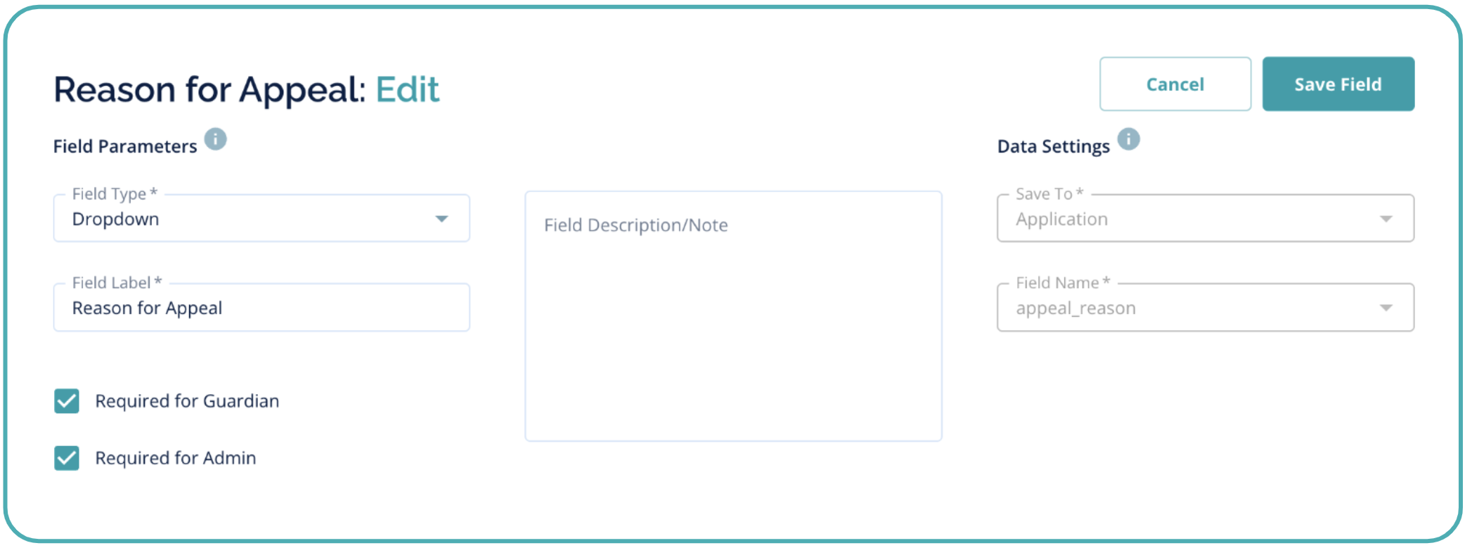 Required for Admin - Makes the field required for admin users. If the field is empty when an admin tries to save an appeals form, the admin will receive an error and the form will not be saved.