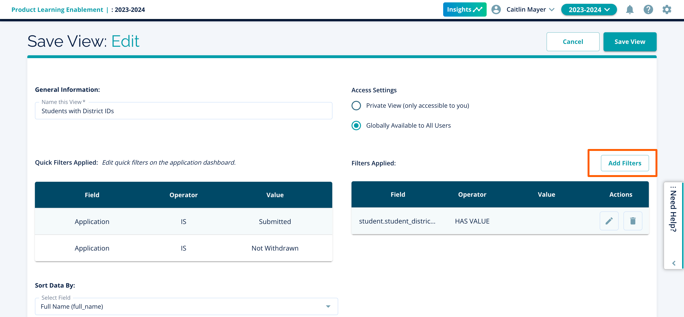 Note: Any quick filters that were used in the view setup will not be able to be edited. A new view should be created with the appropriate quick filters and other filters in place.