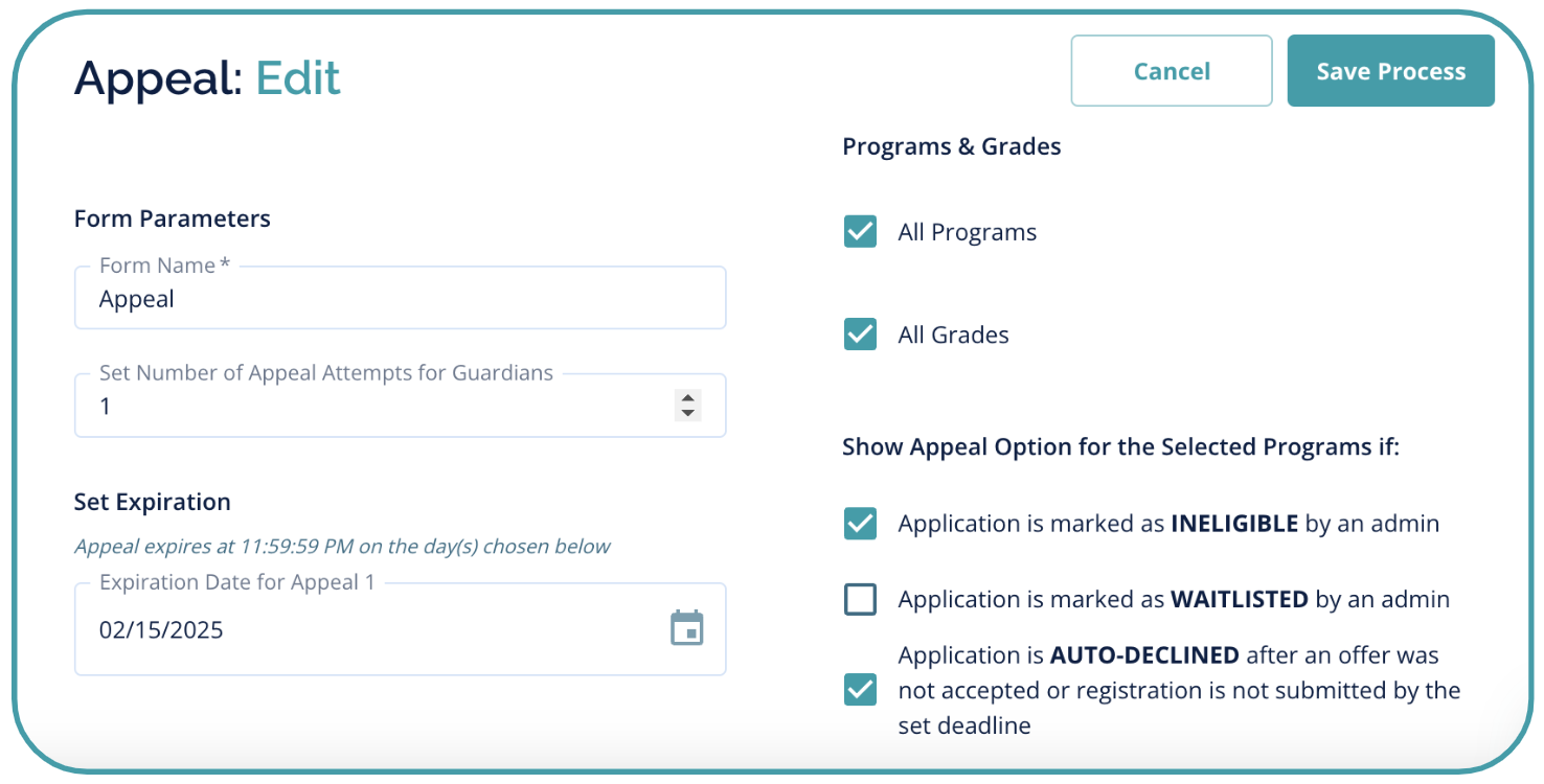An appeals process is available for organizations who offer a formal process for families to dispute or provide additional information regarding application eligibility, waitlist placement, or an auto-decline action.