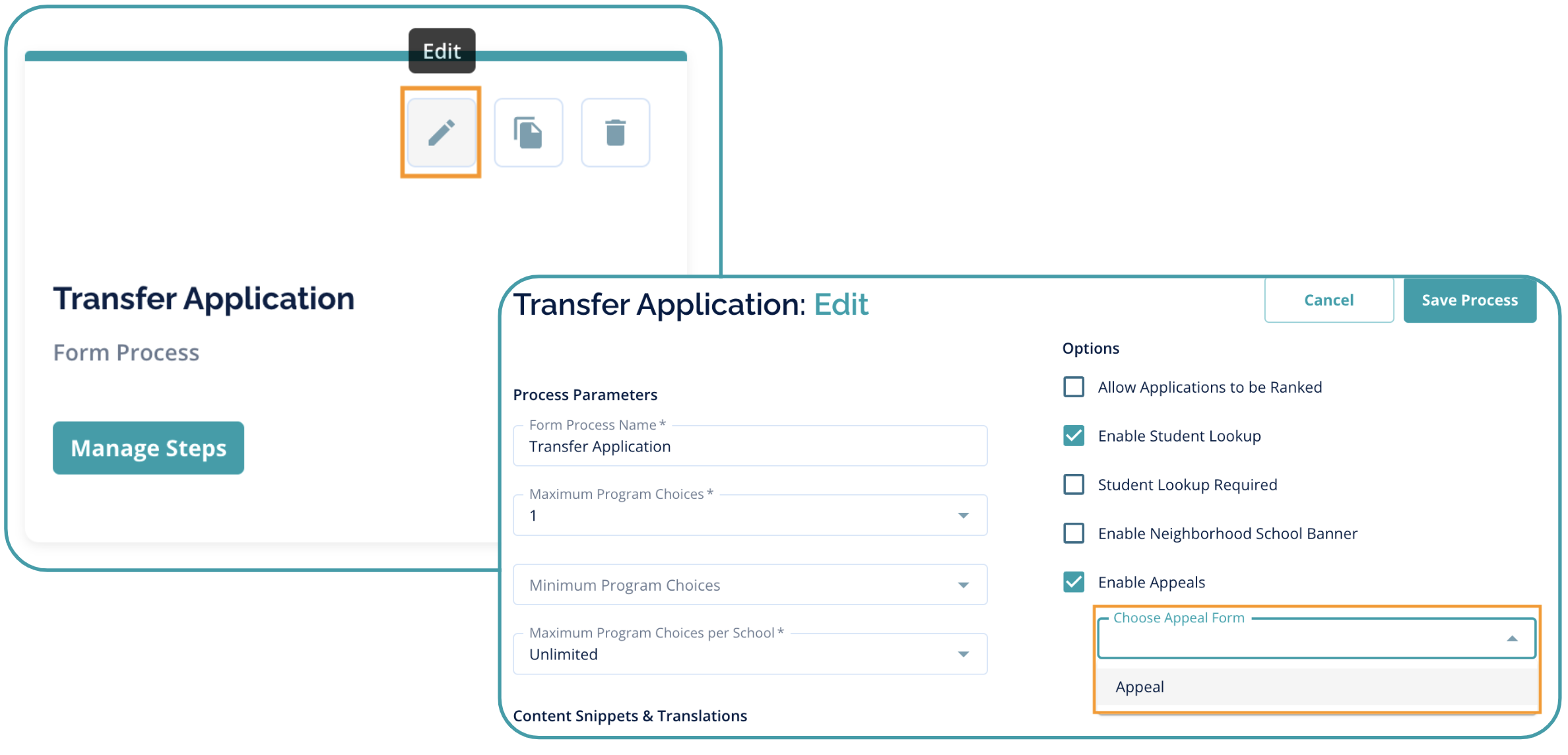 4. Navigate to the application form process that will use this Appeal form and click Edit. Once the Enable Appeals setting is selected, use the dropdown menu to select your Appeal form, and Save.