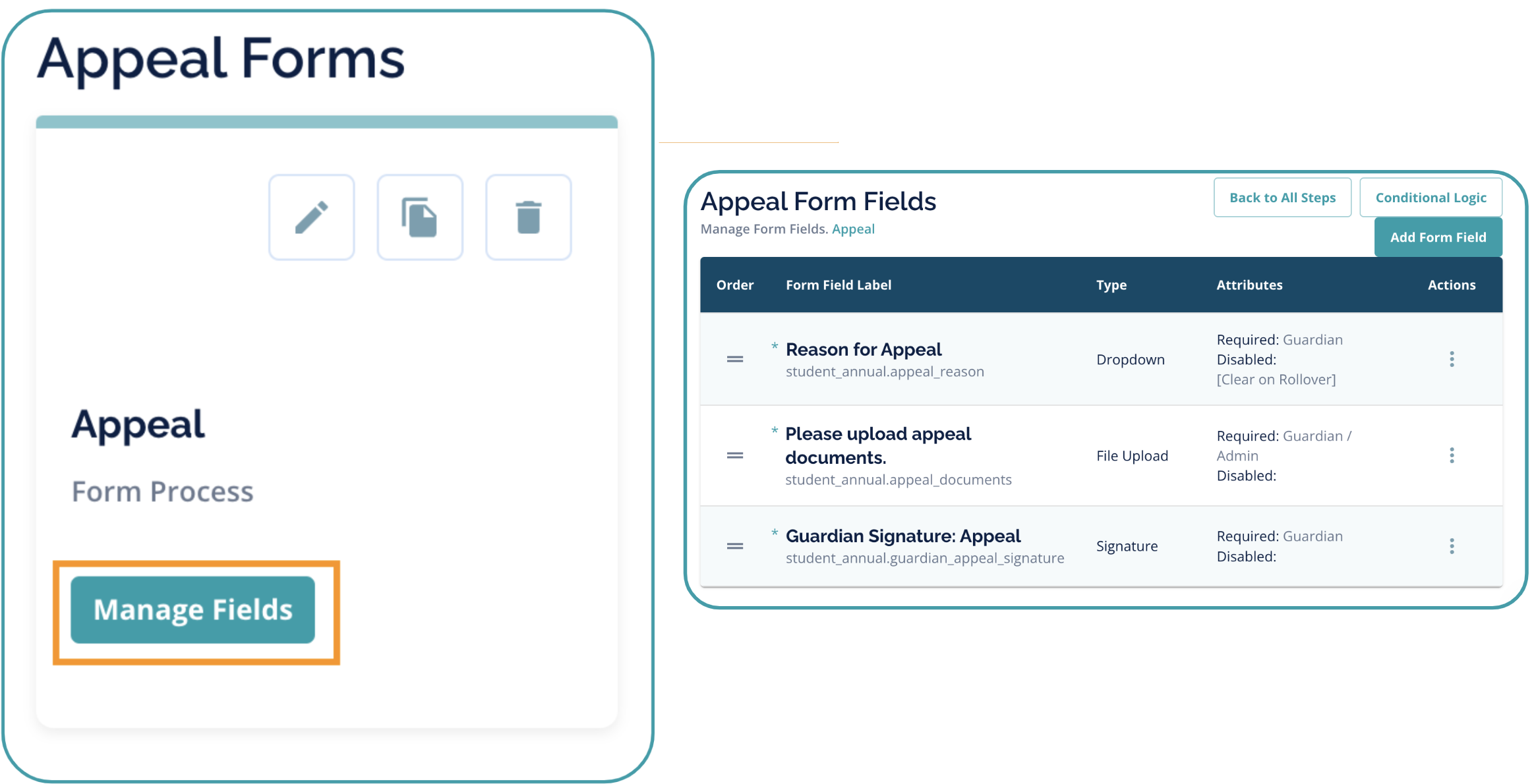 3. After Saving your Appeal Form settings, click Manage Fields to add fields to capture information families must provide for the appeal process.