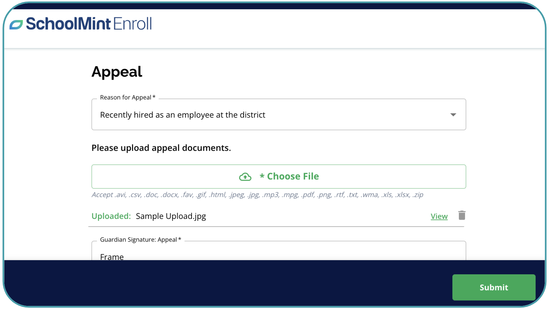 Guardians complete fields on the custom appeal form and Submit.