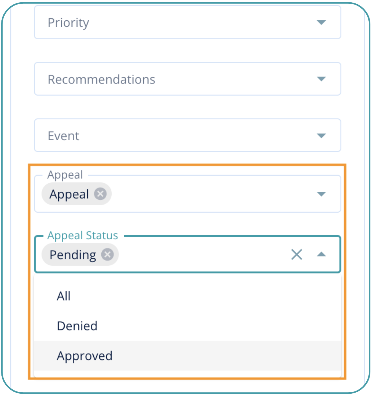 Within each appeal application, an orange pill displays the status of the appeal.