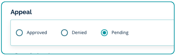 Make a determination (Approved, Denied, Pending) on the appeal per your process criteria and Save.