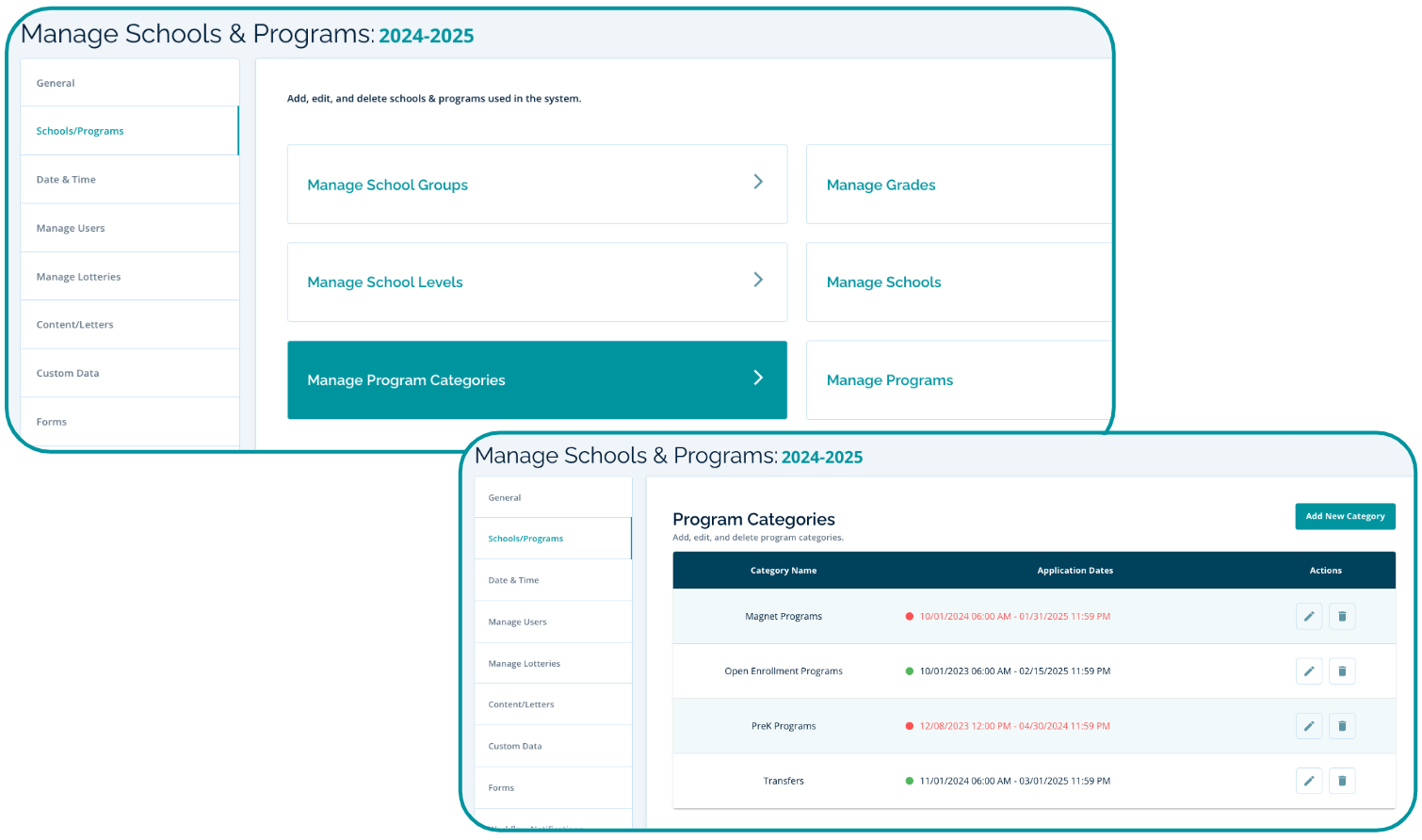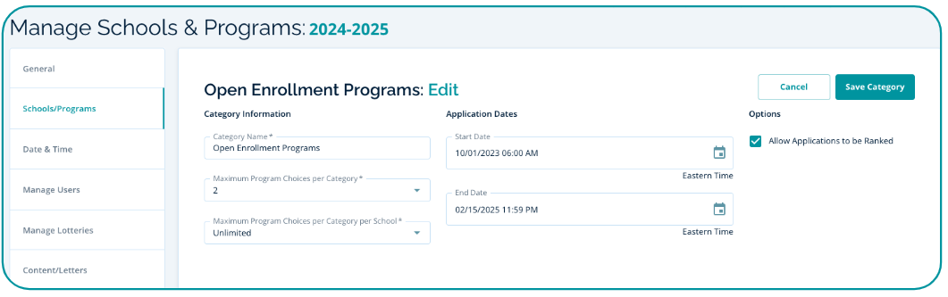 A Program Category gives you the option of setting consistent Application Start/End dates for all programs in the category. You can also turn on Ranking for all programs in a category and set limits on how many programs from this category a family may apply to.