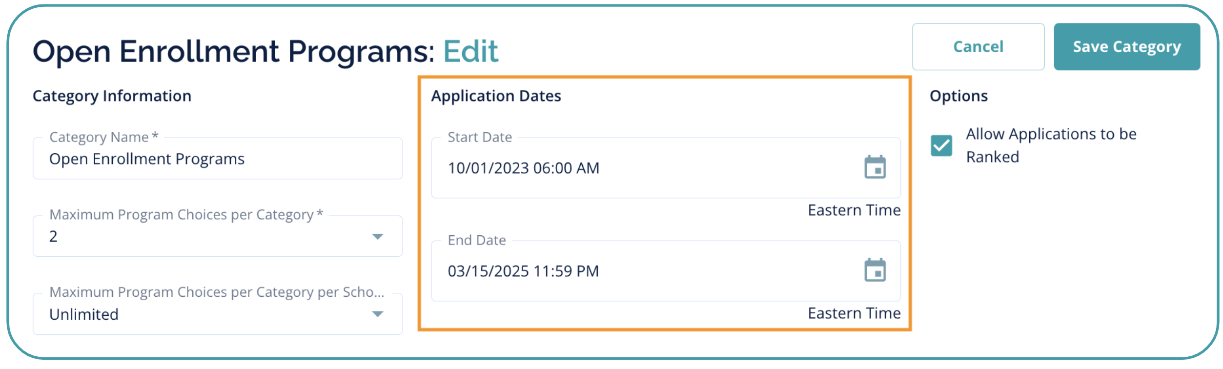- Application dates can be managed for an entire Program Category under Settings > Manage Program Categories > Edit