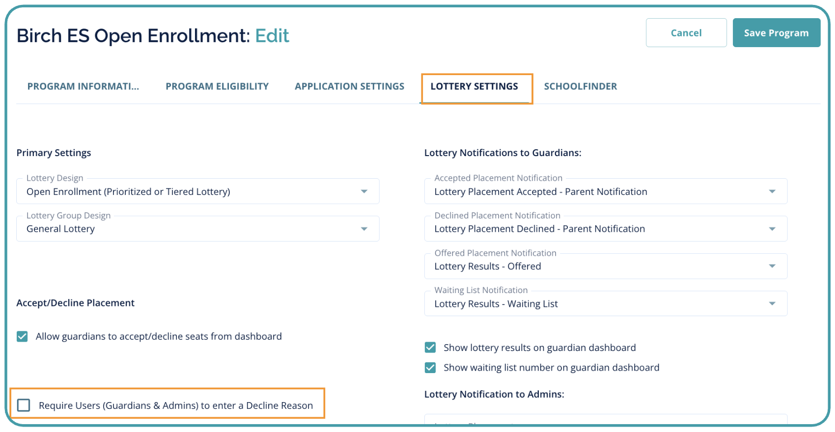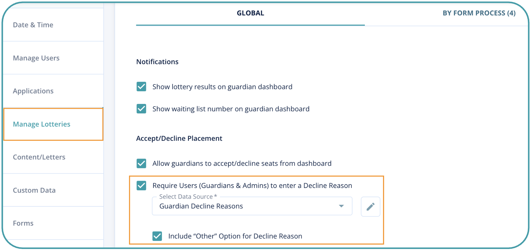 Navigate to Settings > Manage Lotteries > Lottery Settings > Global tab to enable the Decline Reasons functionality. Once the Decline Reasons are enabled at the Global level, this feature will be displayed on each Program's Lottery Settings tab to be managed at the Program level, as needed.