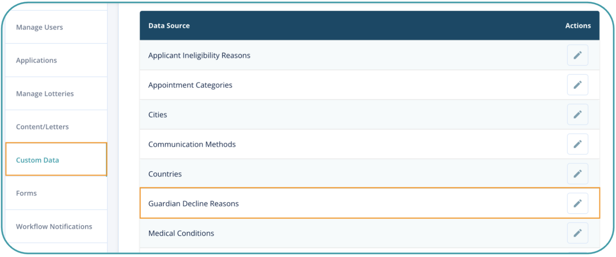 To review the list of default "Guardian Decline Reasons" to make edits for your organization, navigate to Settings > Custom Data > Custom Data Sources > Guardian Decline Reasons.