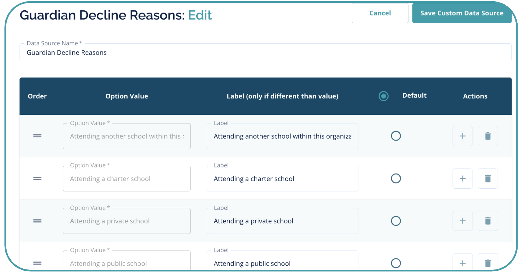 The Data Source: "Guardian Decline Reasons" will be pre-selected for use once the feature is enabled. You have the option of including an "Other" reason for families to select.