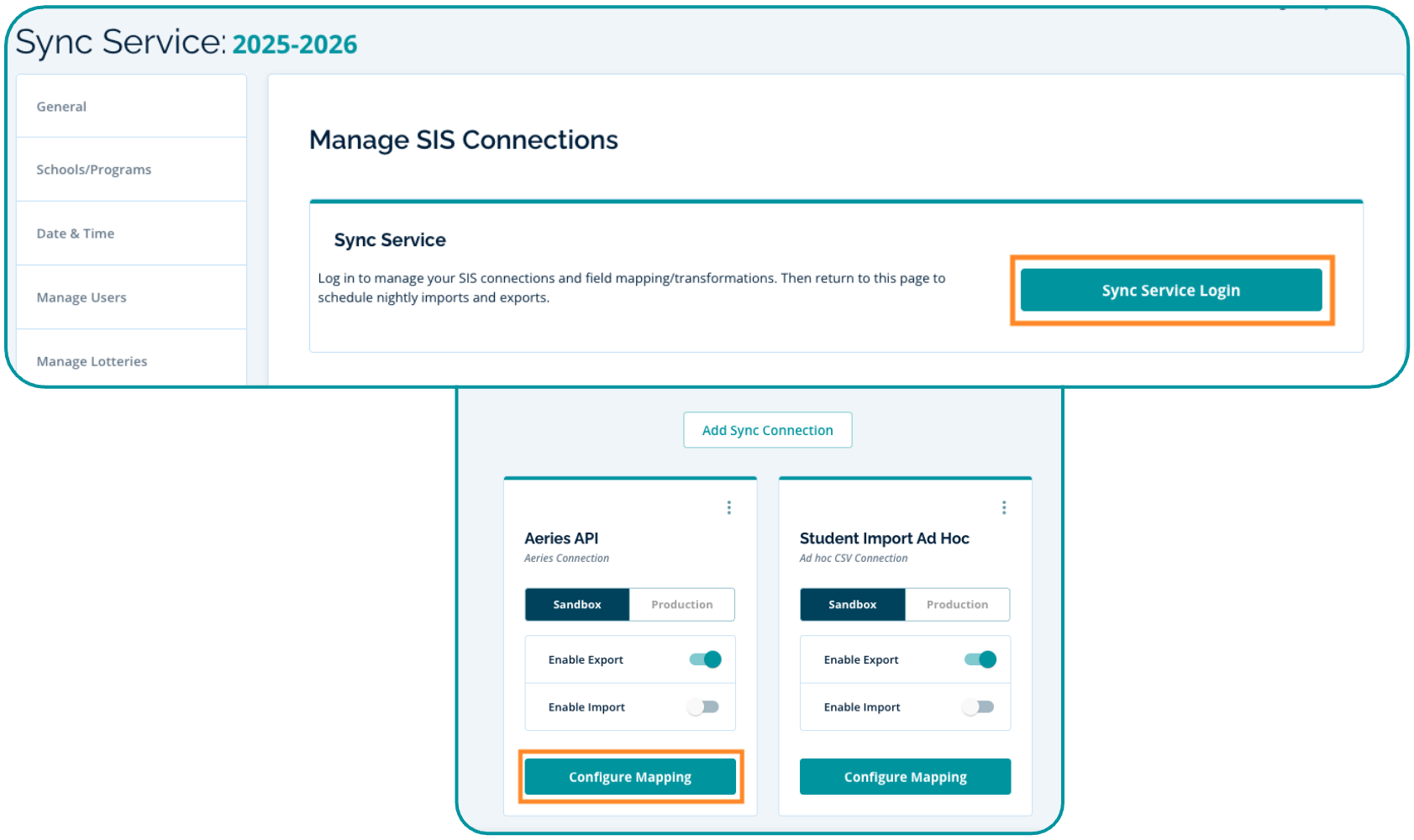 Navigate to Settings > Sync Service > Sync Service Login. On your Aeries API connection card, click "Configure Mapping".